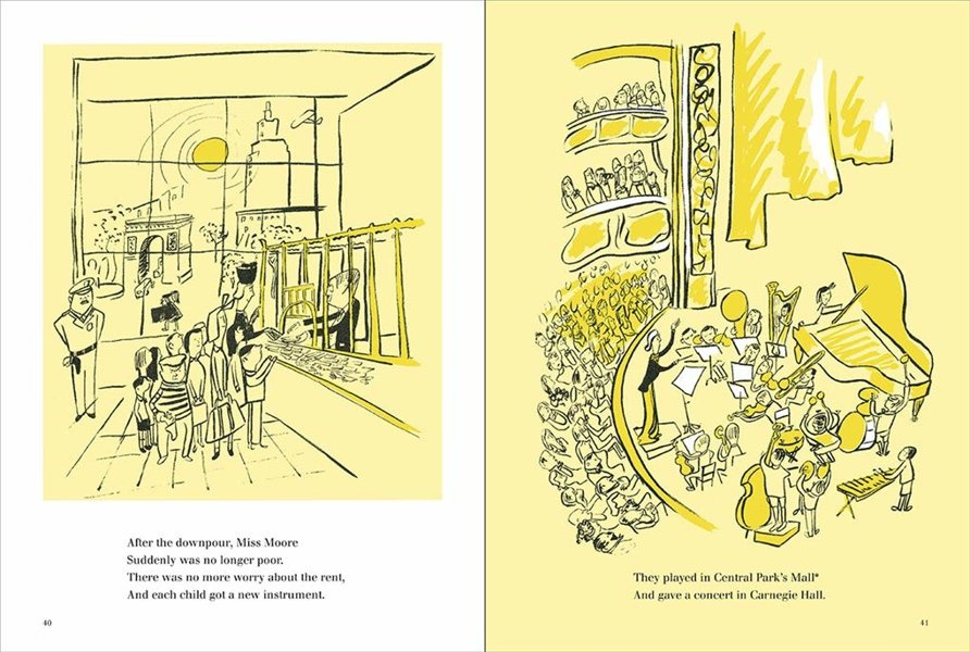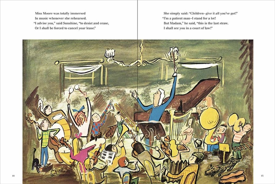 The story, which concerns a children's music school - and umbrellas! - has the gentle touch of Madeline, as well as some thoroughly ridiculous situations. At the same time, adults all too familiar with the housing shortage will join the children in applauding when the gentle little music school teacher outwits a landlord who "doesn't permit cats or doggies or people who have noisy hobbies". And everyone will rejoice in the happy ending to this delightful story.'